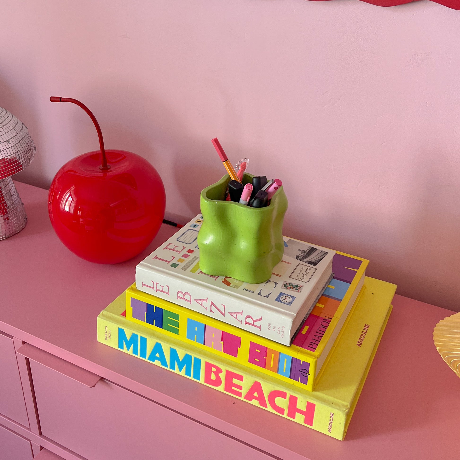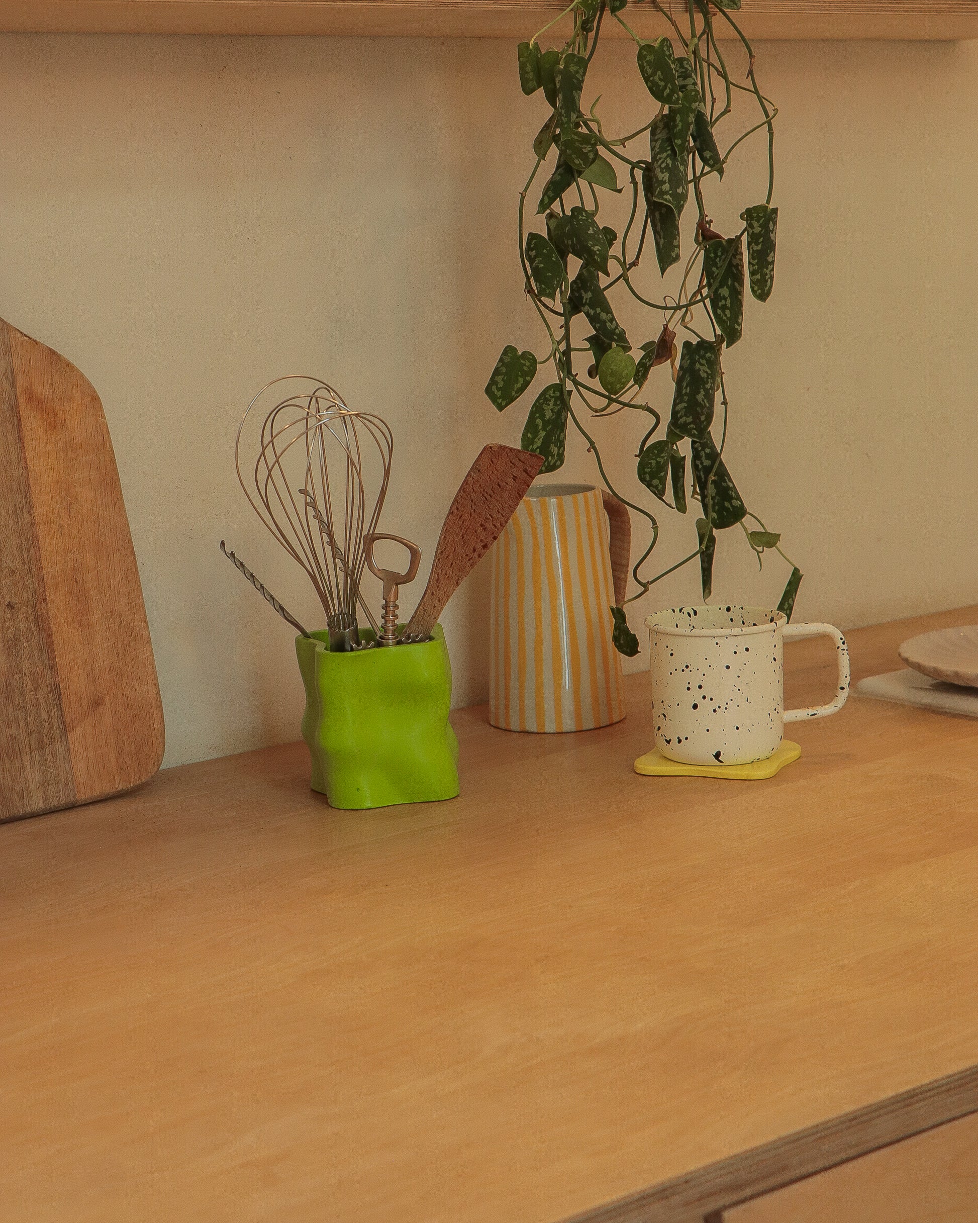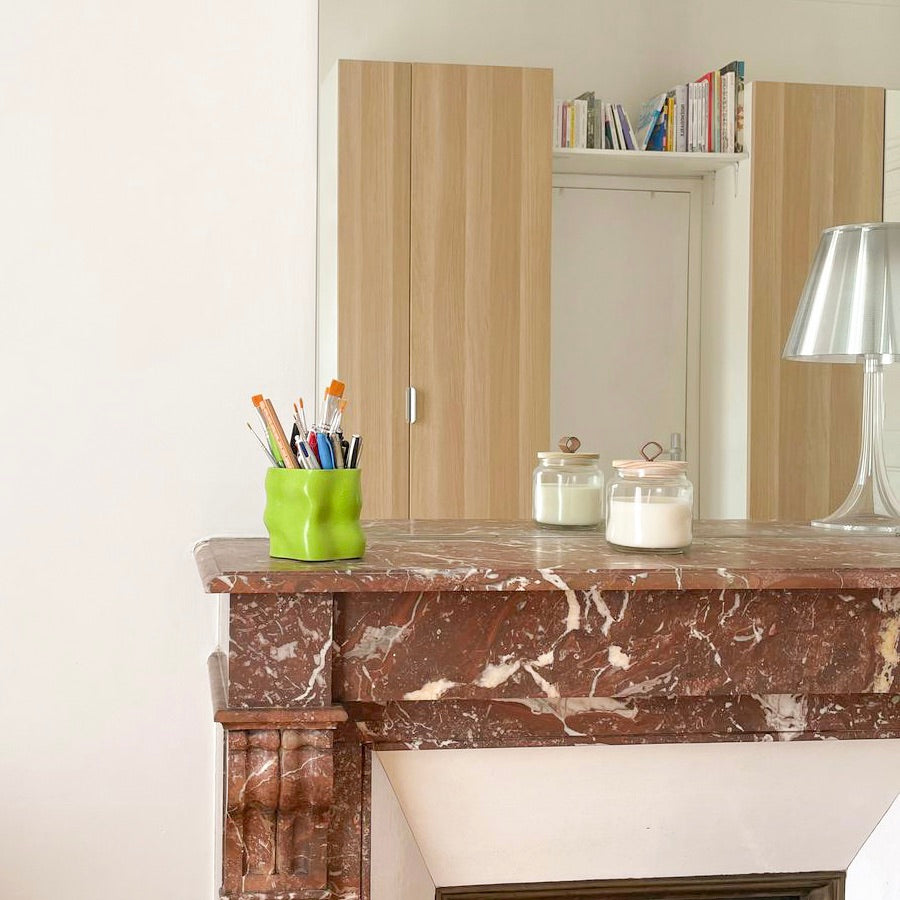 La matière première de toutes nos créations est la jesmonite. Celle-ci est composée de poudre de gypse et d’un liant acrylique à base d’eau, ce qui en fait une alternative écologique aux résines traditionnelles à base de pétrole. La jesmonite est connue pour sa durabilité et sa résistance, tout en étant non toxique et non cancérigène. Son processus de fabrication nécessite moins d’énergie et génère moins de gaz à effet de serre. En choisissant ce matériau, on contribue à réduire notre empreinte carbone.