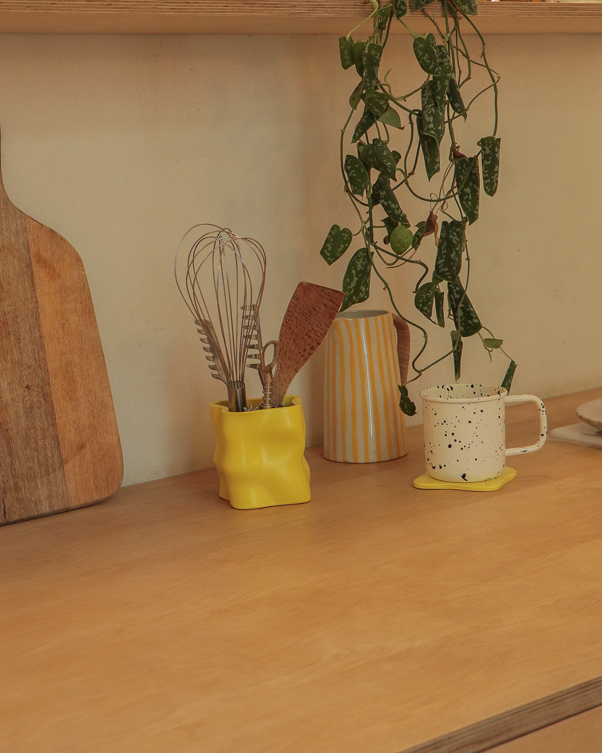 La matière première de toutes nos créations est la jesmonite. Celle-ci est composée de poudre de gypse et d’un liant acrylique à base d’eau, ce qui en fait une alternative écologique aux résines traditionnelles à base de pétrole. La jesmonite est connue pour sa durabilité et sa résistance, tout en étant non toxique et non cancérigène. Son processus de fabrication nécessite moins d’énergie et génère moins de gaz à effet de serre. En choisissant ce matériau, on contribue à réduire notre empreinte carbone.